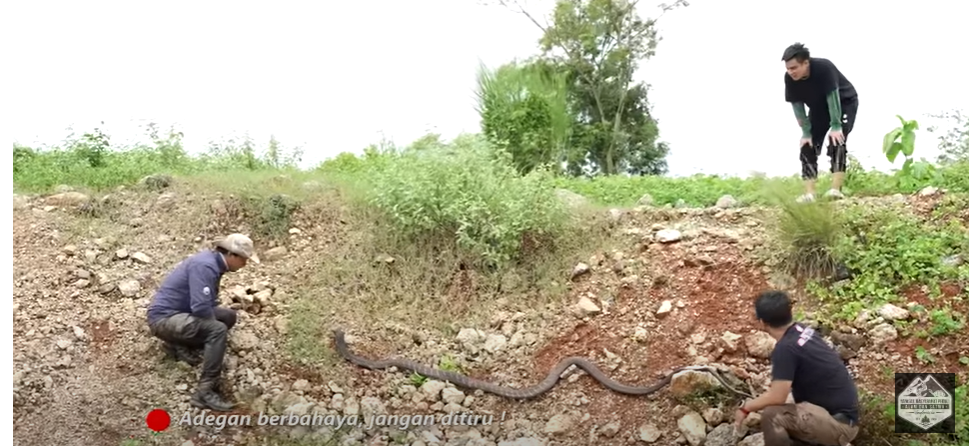 Dengan kamera menyala dan kru di belakang, Baim terus bertanya-tanya soal teknik menangkap ular berbisa.